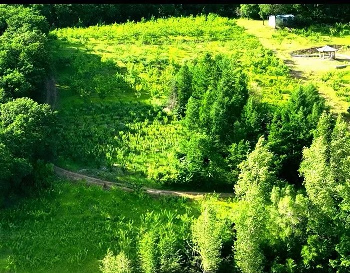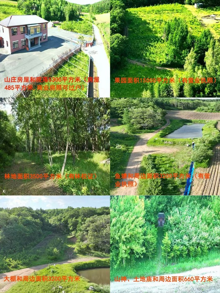 山庄总面积约3万平方米,其中山庄房屋和院落总面积5300平方米(房屋485 平方米,商业房照可过户)果园面积15000平方米(有营业执照)林地面积3500平方米(有林权证):鱼塘和周边面积 3200平方米(有营业执照):大棚和周边面积 2100平方米山神、土地庙和周边面积 660平方米
